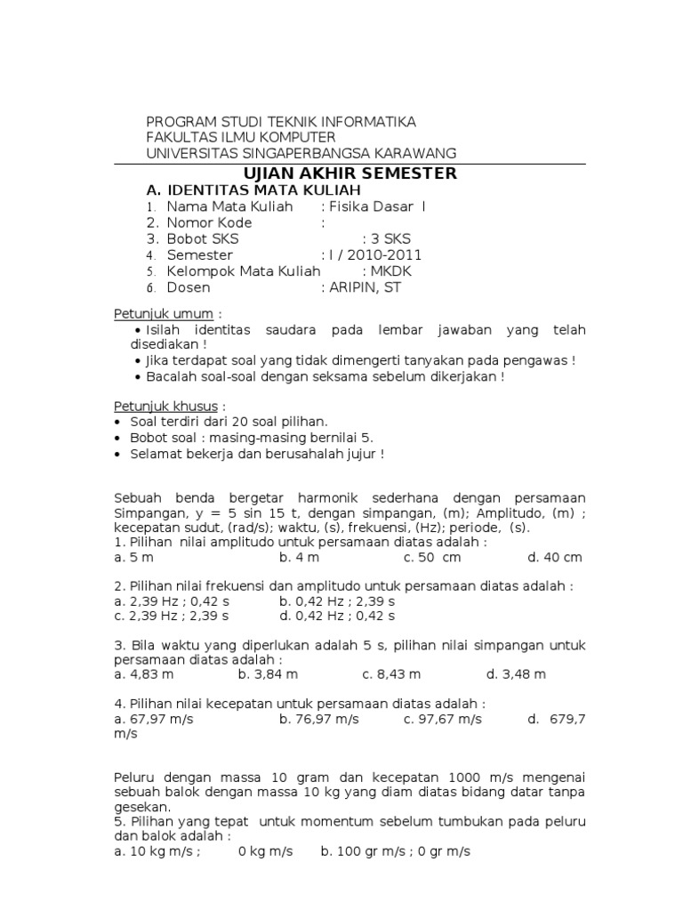 Soal Fisika Dasar 1 Untuk Teknik Pdf Document from static.fdokumen.com Pada dasarnya terdapat pipa saluran yang penampangnya 1 cm2. 2 (dua) kali uts dan 1 (satu) kali uas (sebagai perbaikan) per semester. Selamat datang di artikel contoh soal gerak parabola di fisika dasar. Pemecahan soal fisika, khususnya dalam mekanika, pada umumnya didasarkan pada hukum. Buku ini berisi materi diktat fisika dasar i yang diajarkan di semester pertama tingkat pertama fakultas sains dan teknik di perguruan tinggi negeri maupun swasta. Rahasia memahami soal uts 1 fisika dasar 1 di tpb itb bab dinamika. Subjek fisika, dibedakan dari kimia dan biologi. Sebuah sepeda motor bergerak dengan laju 90 km/jam mendekati sebuah mobil yang bergerak pada arah yang sama dengan laju 80.